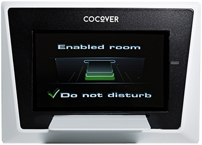 All’interno della camera, il terminale transponder COCOVER abilita i servizi dell’ambiente e avvia la welcome experience al momento dell’ingresso dell’ospite. Il sistema comunica in tempo reale con la reception, segnalando la presenza o l’assenza dell’ospite e contribuendo a una gestione operativa più ordinata. La funzione “non disturbare” è facilmente attivabile dal pannello touch, rendendo il controllo immediato e intuitivo.
